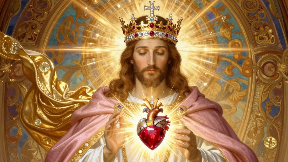 This image shows Jesus Christ as a regal king, adorned in a white mantle and pink cape. A radiant Sacred Heart gem on his chest emits golden rays, set in an opulent Art Nouveau style with divine light.