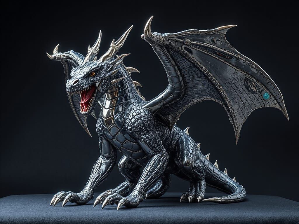 This image shows a powerful dragon with metallic chrome scales and claws, set against a dark and ominous futuristic background, with intricate reflective details and a cyberpunk aesthetic reminiscent of Syd Mead's designs.