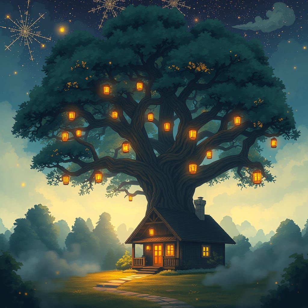 This image depicts a serene, misty forest scene with a cozy house aglow under a majestic oak tree, amidst a star-studded sky with cosmic clouds, evoking a sense of wonder in a breathtaking, flat, high-quality anime landscape.