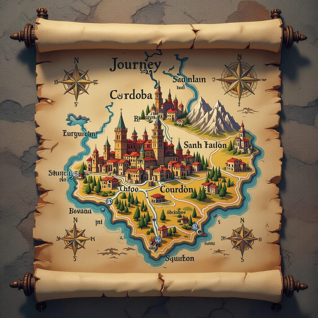 This detailed matte painting map illustrates a fantastical journey route. It features a tutorial-style visual with deep, rich colors and intricate details, resembling a paper scroll for a quest.