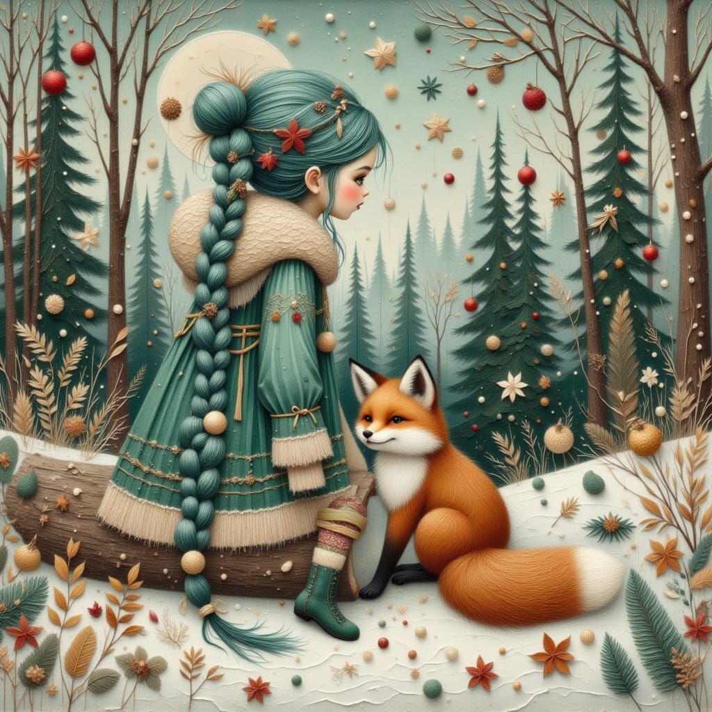A young girl with long teal braids sits by a fox in a peaceful, textured winter forest. The scene captures a moment of quiet connection amidst snowy trees.