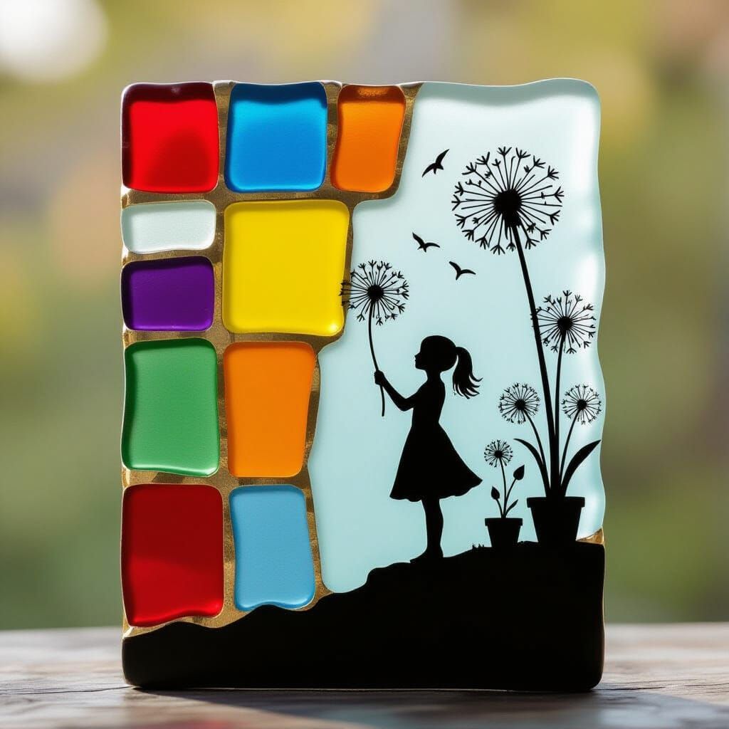 A free standing sculpture of Overlapping colorful squares and rectangle abstract, shapes are made from different colors of sea glass each section is lined in gold, 2/3 from the top A whimsical scene featuring a silhouette of a young girl standing at the edge of a cliff with a tall dandelion in her hand ...