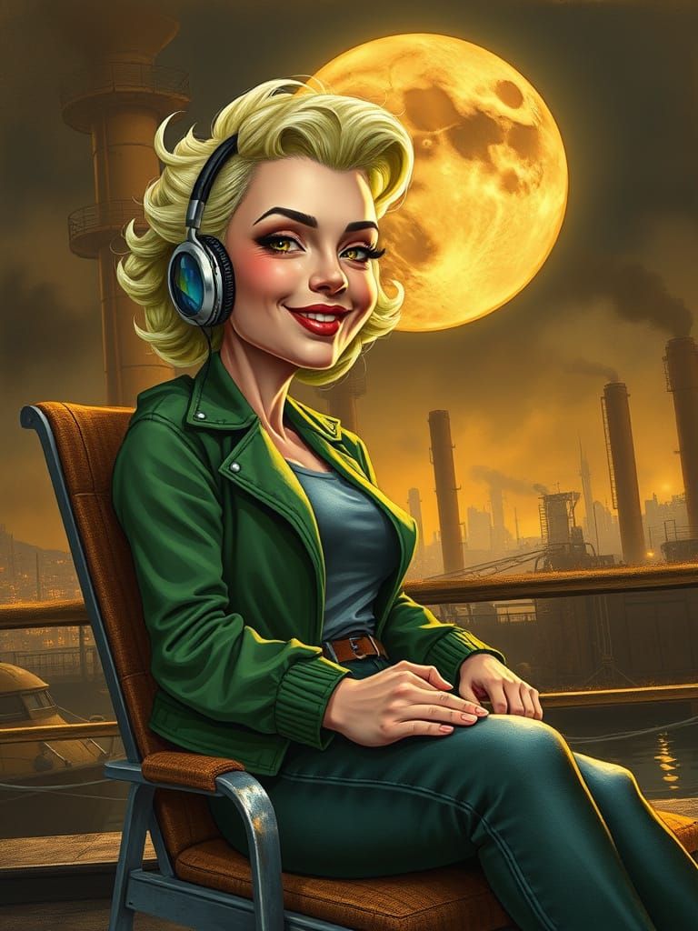 Maryln Monroe Caricatures, cell shade, vecto, tetradic colour, ink linework, orange eye, lime green hair, relaxing on a lounge chair, harbour, smiling, modern casual with green jacket and jeans, green jacket, grey shirt, headphone, upper body dynamic, dramatic, powerful. intricate details, mixed media ...