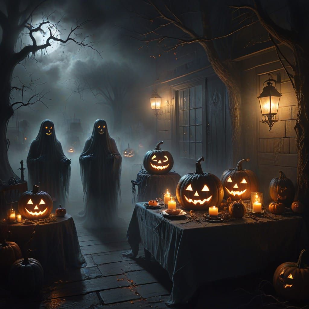 This hyperdetailed charcoal drawing captures a spooky birthday party with wispy ghosts, grinning pumpkin lanterns, and eerie luminescence. A mysterious and dark, moody atmosphere prevails.