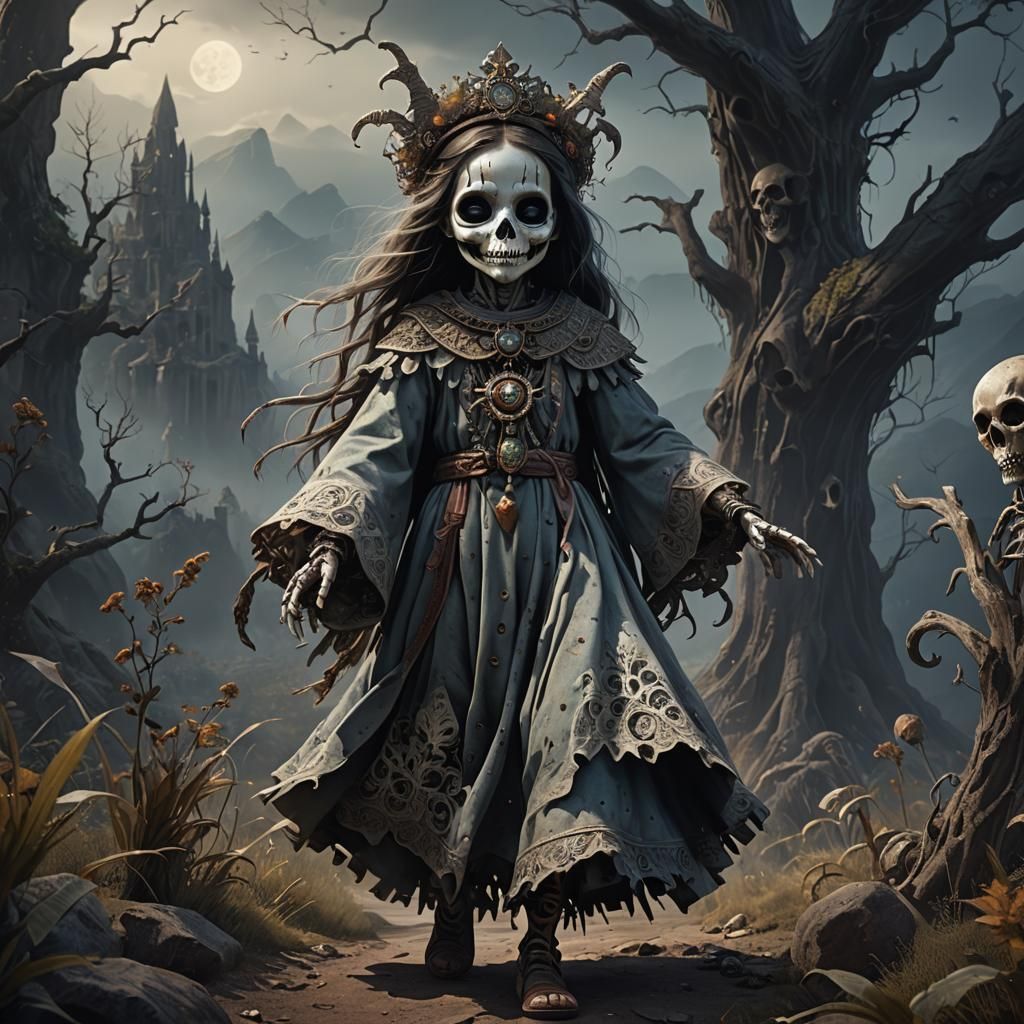 This image depicts a ghostly Acheri spirit with dark eyes and a skeletal appearance, set against a vibrant and detailed fantasy landscape, featuring intricate details and a splash of complementary colors.