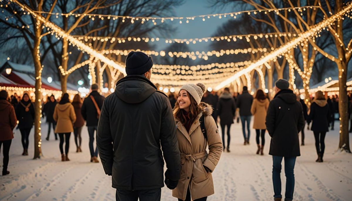 A realistic photograph captures people walking through a festive winter park at night. Warm fairy lights illuminate joyful couples. The professional photo features a soft focus, golden hour lighting and bokeh.