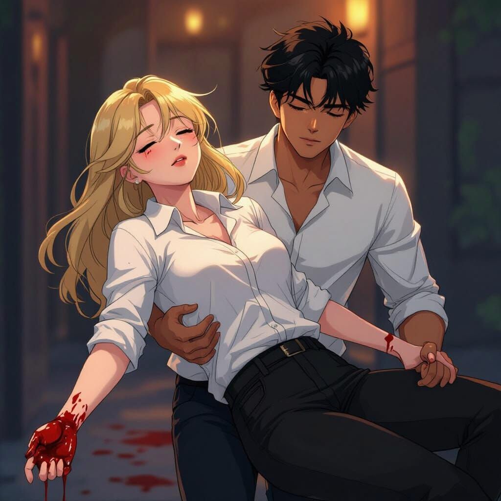 This image shows a dramatic scene of a fair-skinned blonde girl, unconscious and bleeding, being carried by a dark-haired man. The artwork features cel-shaded lighting and deep colors in a manga-inspired style.