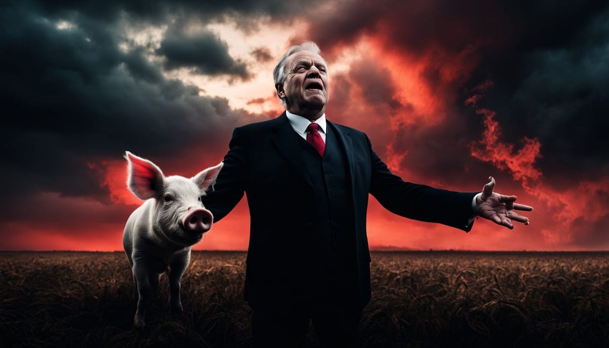A haunting portrait of a politician with a pig's snout and fangs, bathed in divine light with a red sky and dark clouds, capturing the essence of horror and the supernatural in cinematic detail