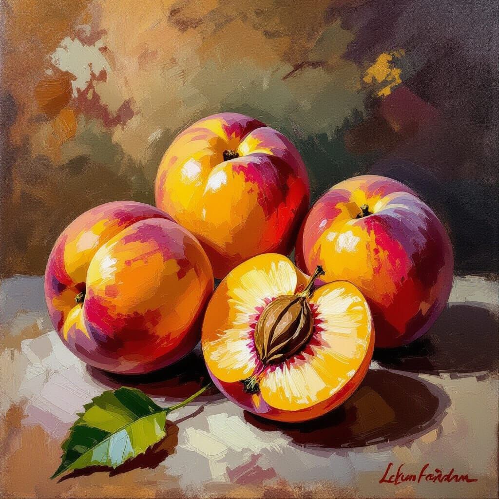 This image showcases delicious ripe peaches, cut in half to reveal juicy, glistening flesh. Rendered in a vibrant impasto style with thick brushstrokes, it evokes a classic still life with a modern feel.