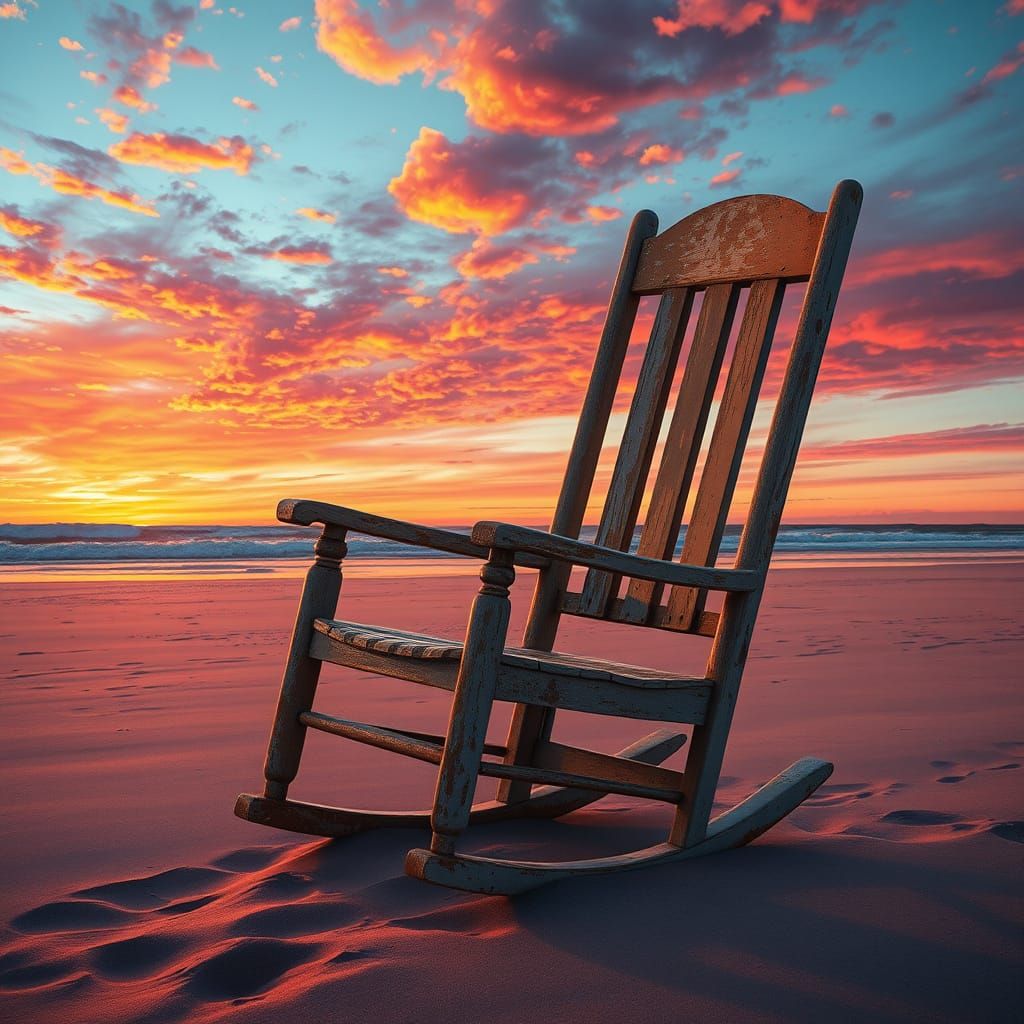 This image shows a weathered rocking chair on a desolate beach at sunset. Fiery colors fill the sky as ocean waves crash against the shore in this digital artwork. The piece evokes a nostalgic, semi-realistic style.