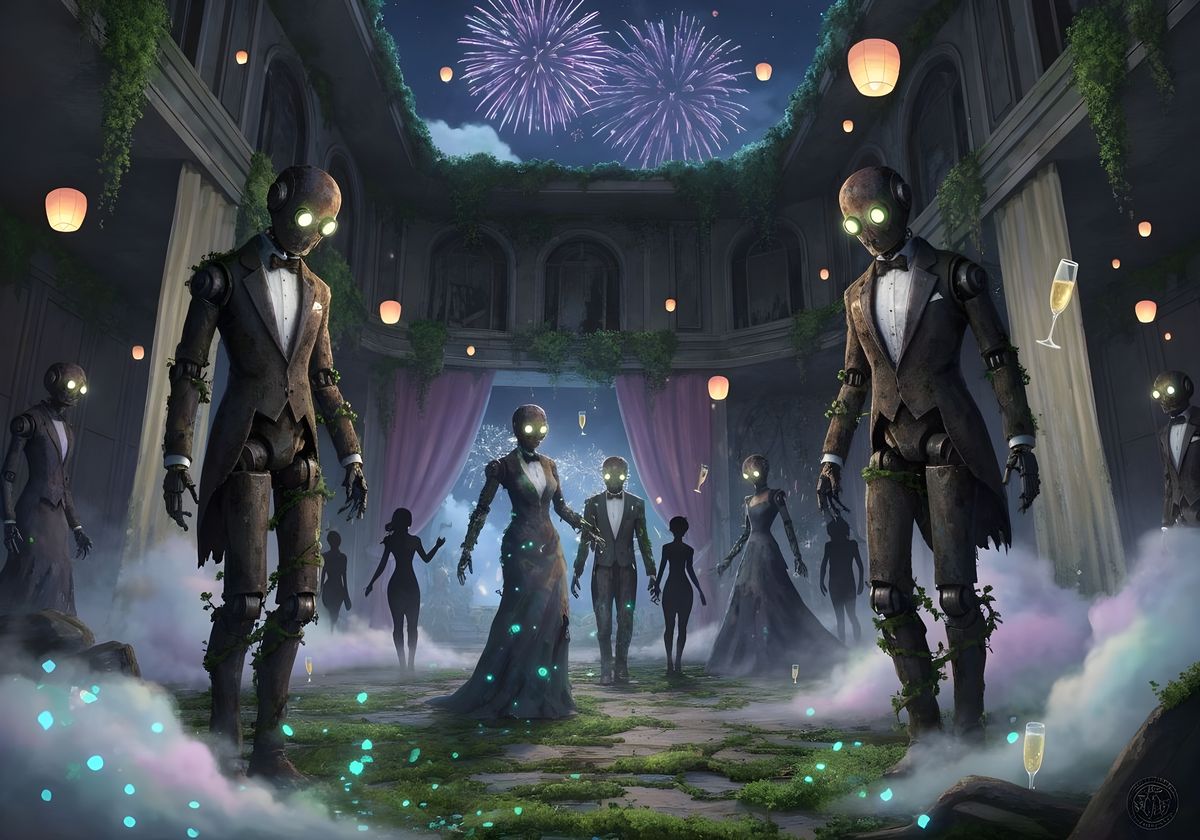 Abandoned grand ballroom overgrown with ivy, moss, and bioluminescent plants, rusted humanoid robots dressed in tattered tuxedos and gowns entwined by vines. Up to ten guests include spectral ghosts and shadowy demons mingling among the robots. Floating pastel fireworks illuminate the scene while paper lanterns drift across the night sky. Robots’ eyes glow faintly through rust and moss, their movements mechanical yet graceful. Shadows twist unnaturally, adding an eerie tone. Champagne glasses float mid-air, curtains ripple in the wind, soft clouds of pastel mist drift through the ballroom. Pale moonlight mixes with warm lantern and firework glows, highlighting reflective surfaces, plant textures, and glowing eyes. Atmosphere tense, whimsical, mysterious, cinematic anime-style lighting, ultra-detailed textures.