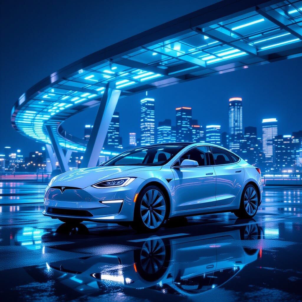 This image shows an electric sedan parked beneath a futuristic glass overpass at night. Soft neon reflections illuminate wet pavement, with a city skyline in the distance, rendered in a minimalist, tech-forward style.