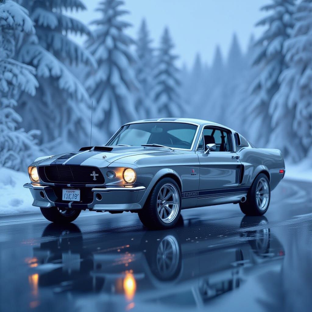 A striking image of a silver 1967 Ford Mustang Shelby GT 500 against a black backdrop. Cosmic Kintsugi-style elements and pastel details create a dreamy, holographic aesthetic.