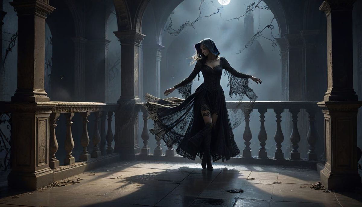 This image shows a solitary dancer in gothic lace performing on a crumbling balcony under moonlight. The style blends dark concept and splash art with dramatic lighting and emotional poses.