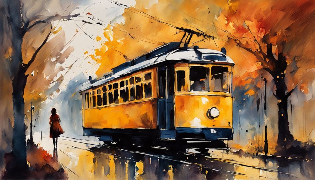 This image features a silhouette of a woman in a navy dress standing by a yellow tram on a beautiful autumn morning. It captures a harmonious blend of expressive watercolor and textured oil painting styles, bathed in warm, diffused light.