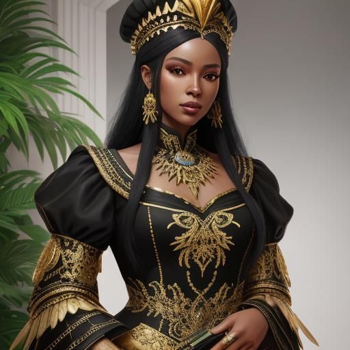 This image shows a stunning, full-bodied portrait of a young Colombian woman in a modern dress. The digital painting features intricate details, complementary colors, and a fantastical, high-resolution aesthetic.