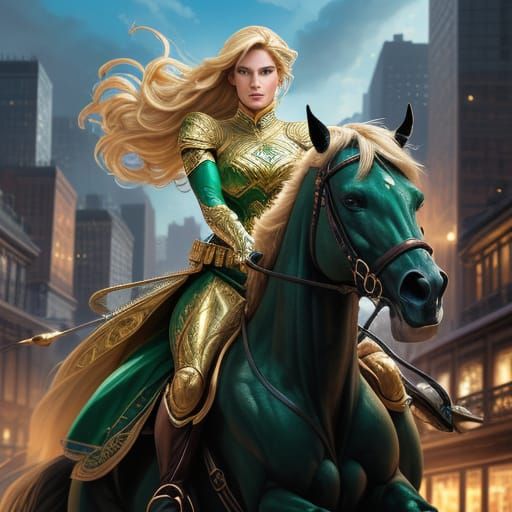This dynamic comic book art features a close-up of a blonde woman on horseback, showcasing intricate details and a dramatic city backdrop in vivid emerald and gold.
