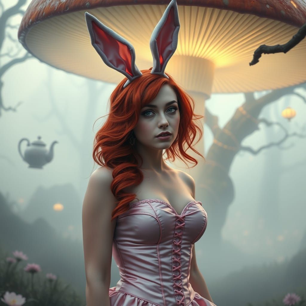 A striking picture of a red-haired woman in a pink corset and bunny ears in a misty fantasy forest. The scene features glowing mushrooms and floating teapots in a dreamlike, hyper-realistic style.