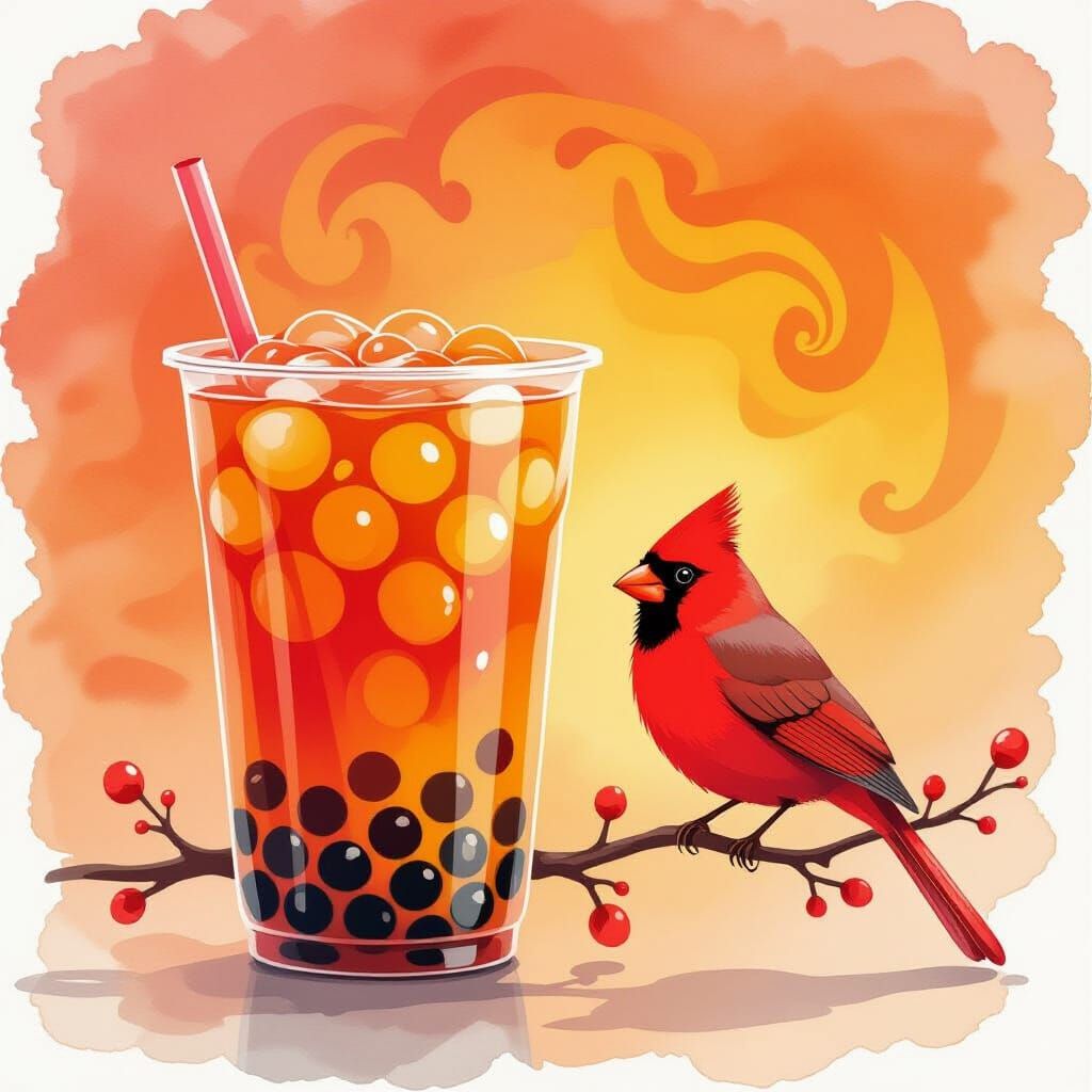 A vibrant illustration shows a ruby-red boba tea with visible pearls next to a red cardinal on a branch. Features a fiery orange-red gradient background, rendered in a liquid watercolor style with bold, fluid lines.