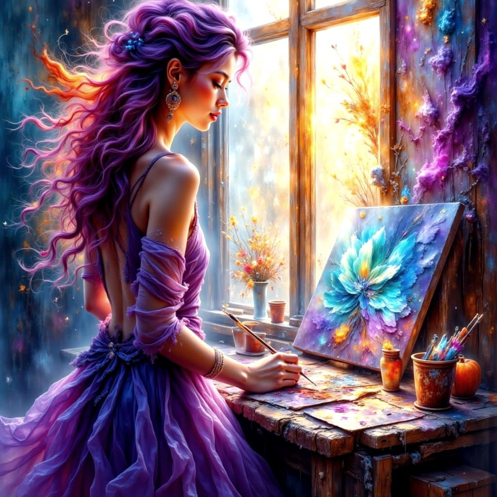 A vibrant, detailed painting featuring a blend of purple, blue, gold, and silver hues. The image showcases a chaotic yet beautiful scene with crepuscular rays, rendered with soft, romantic brushstrokes.