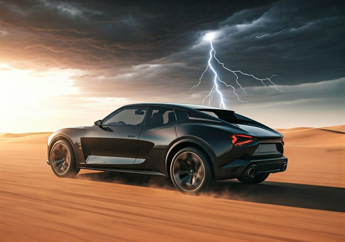 Easily create your own futuristic car images with our free AI image generator, featuring sleek designs and dramatic desert landscapes