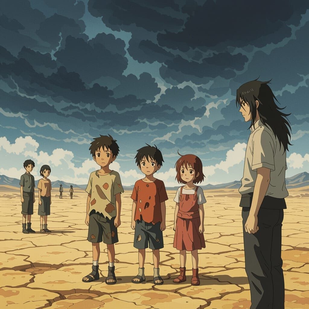 This image shows a group of young Arab children in ragged clothes standing in a barren desert landscape. The style blends fantasy and reality with detailed, vibrant colors to convey an emotional scene.