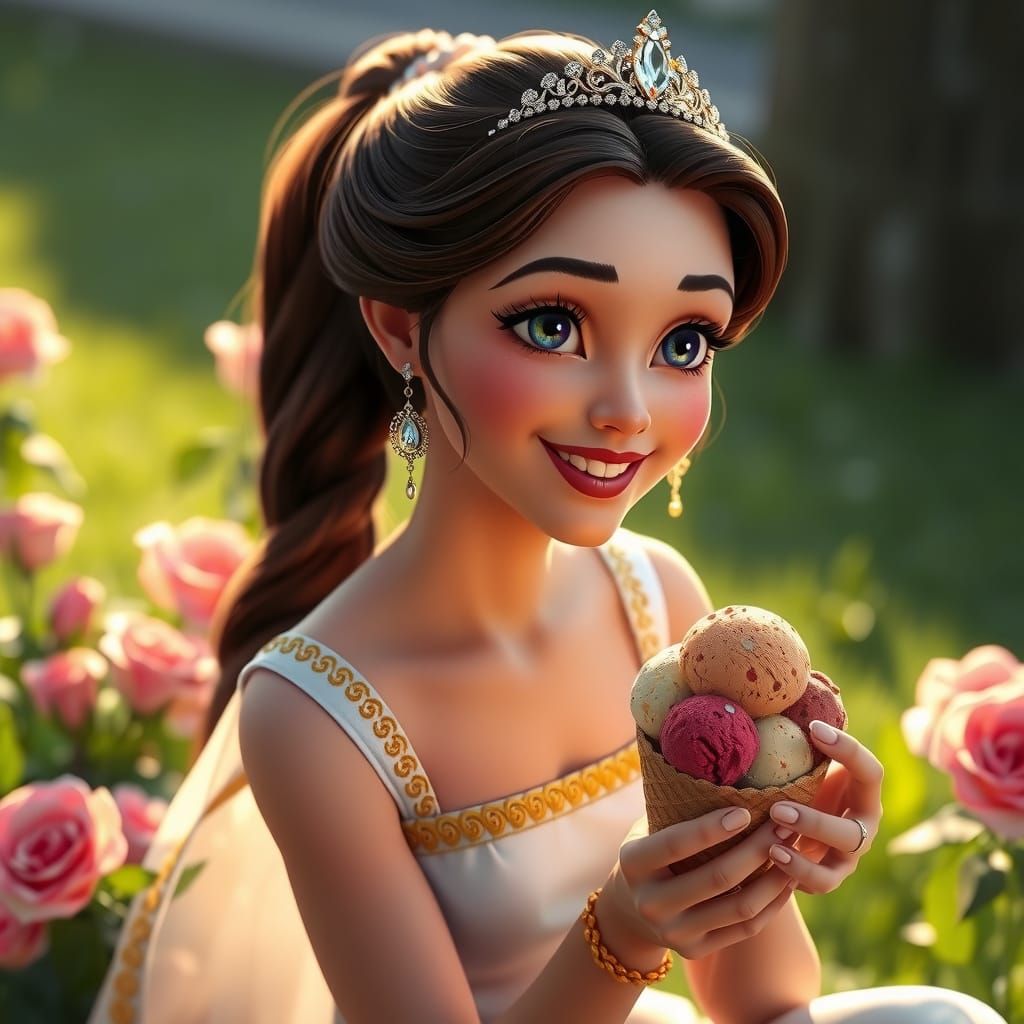 A portrait of Princess Megara from Disney's Hercules enjoying ice cream in a garden. She is depicted with auburn hair, wearing a white Greek-style dress, rendered with dynamic lighting and intricate detail.