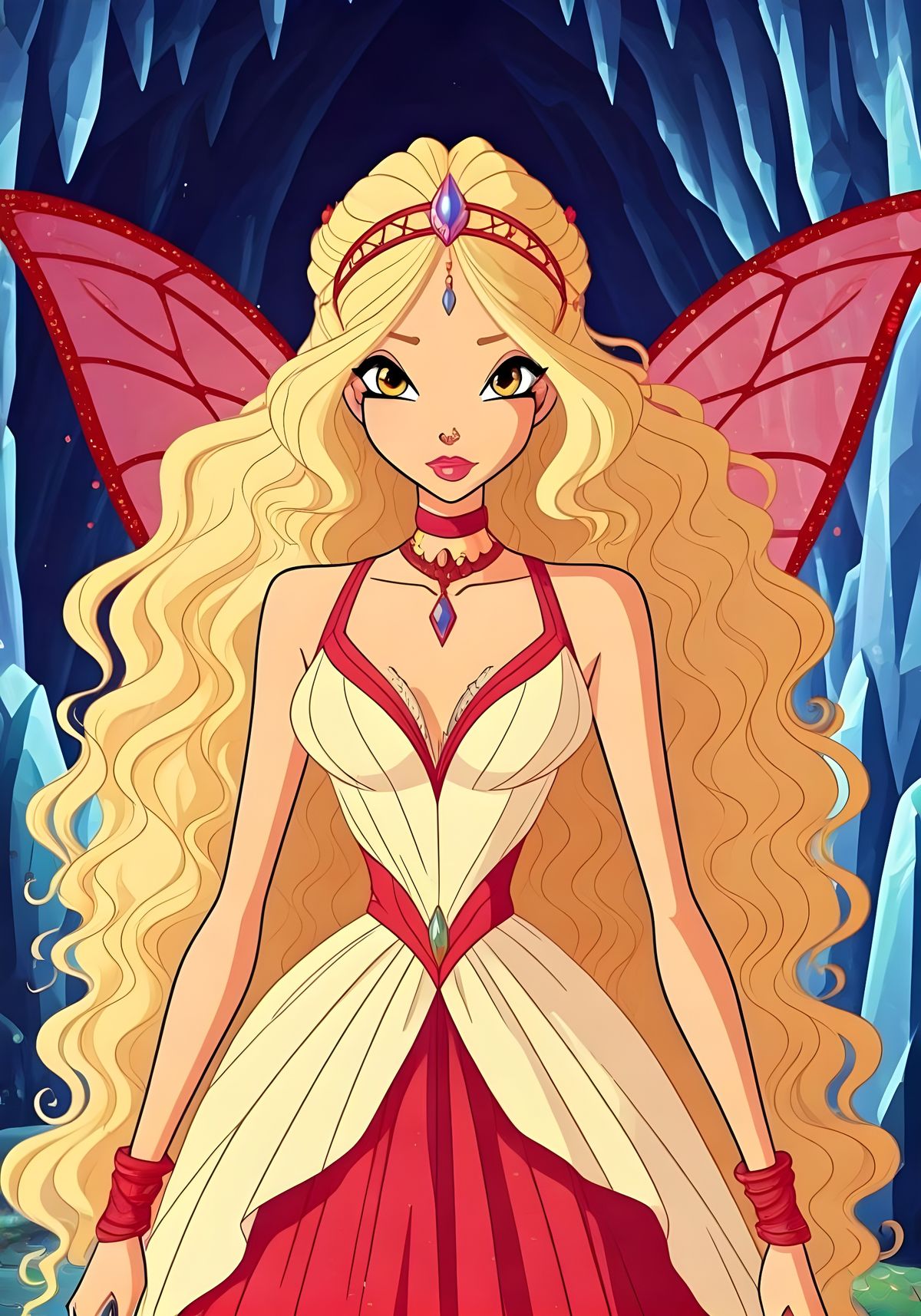 This image is a Studio Ghibli-inspired anime-style portrait of Diaspro from Winx Club, set against a majestic Crystal cave backdrop. She wears a striking ivory and red outfit, adorned with jewels and feathers, and has vibrant maroon and red wings.