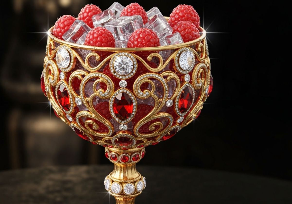 A photorealistic image showcases a golden goblet, ornately decorated with red gemstones and diamonds. The goblet overflows with fresh raspberries and glistening ice cubes against a stark, dark backdrop.