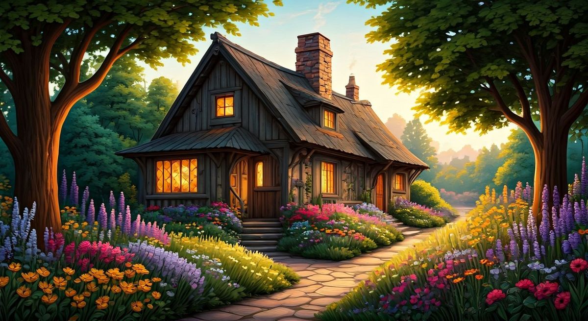 A quaint cottage nestled amongst a vibrant wildflower garden under a warmly lit chimney. The image evokes a sense of rustic charm and fantasy art.