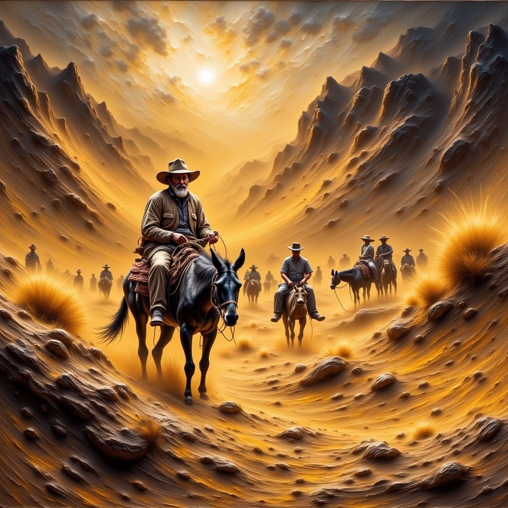 This image captures a grandiose Mexican desert scene with an old man on a donkey in a sandstorm. Rendered with expressive oil painting textures and dramatic lighting.