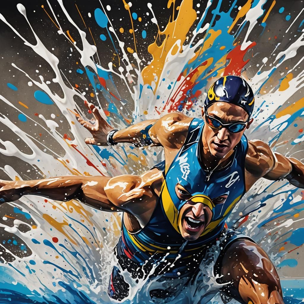 A vibrant graffiti art image of a Paralympic swimmer competing for a gold medal. The artwork features expressive spray paint textures, dynamic splashes of polychromatic acrylic paint, and intense, high-energy lighting.