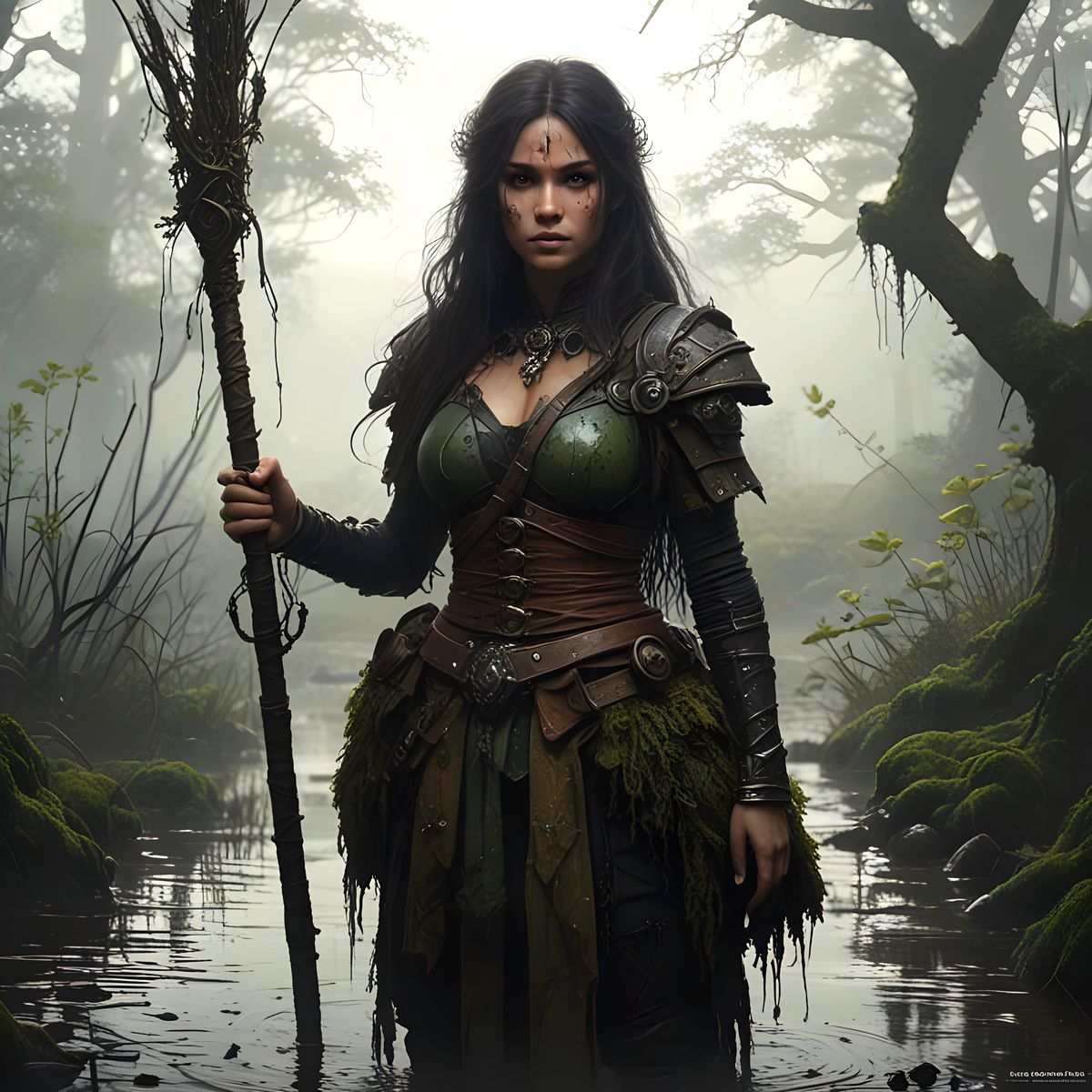 A wiry vivid colour image , swamp-born healer woman with tangled gray-black hair wrapped in cloth and feathers. She wears a layered patchwork of leather and woven reeds, adorned with dried herbs, bone fetishes, and swamp charms. Her eyes are calm and deep-set, and she carries a reed-wrapped staff covered ...