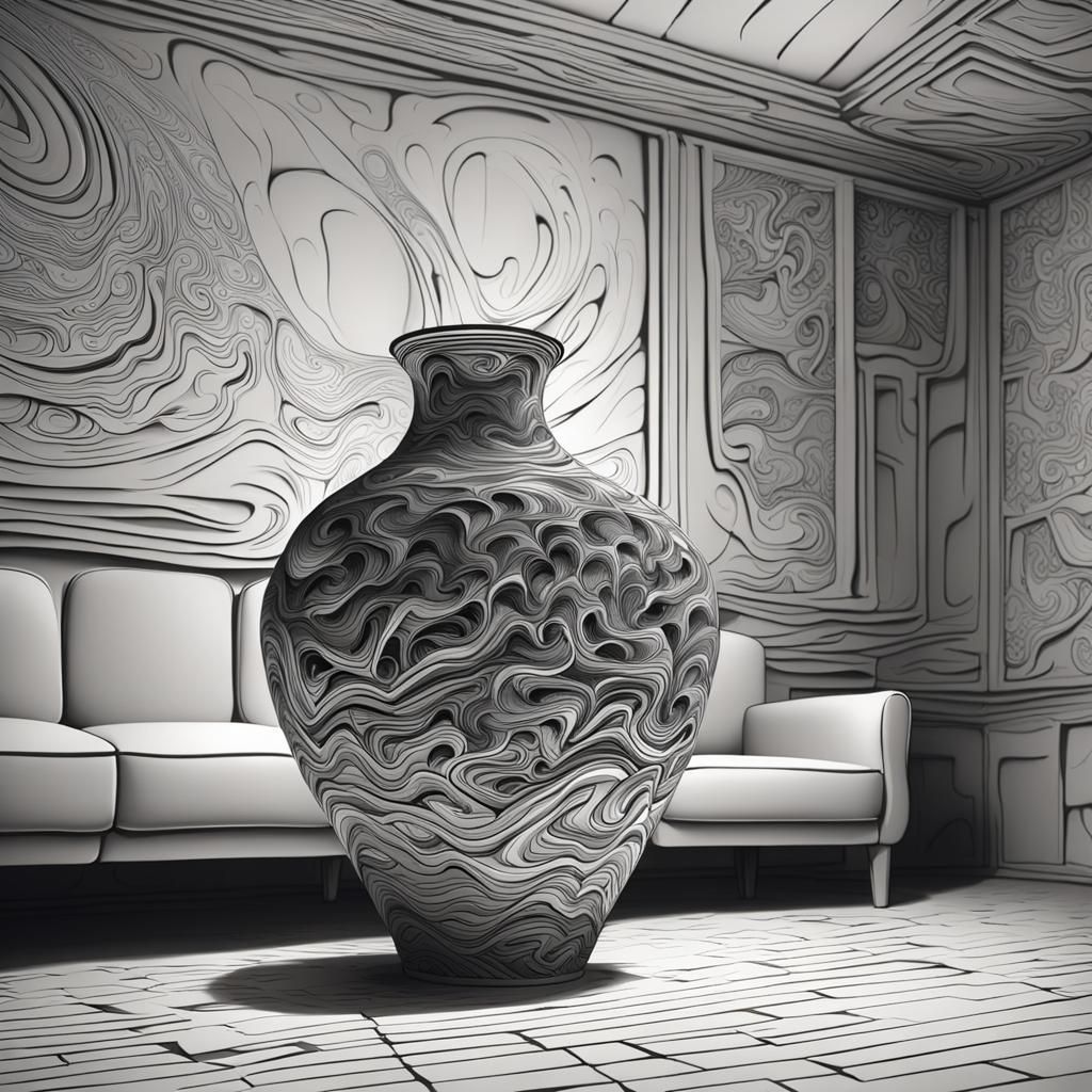 This image shows a menacing vase in a decaying living room, rendered with abstract vector fractal techniques and intricate Zentangle patterns, enhanced by 3D shading.