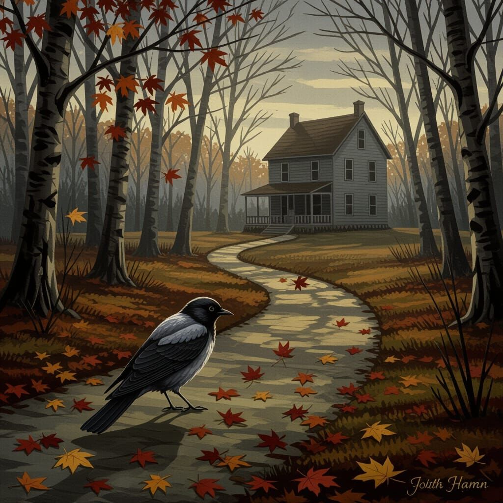 This evocative image depicts a lone, wounded bird in a muted autumnal forest. An empty, silent house looms in the background, creating a mood of profound loneliness and loss, rendered in a surrealist style with magical realism elements.