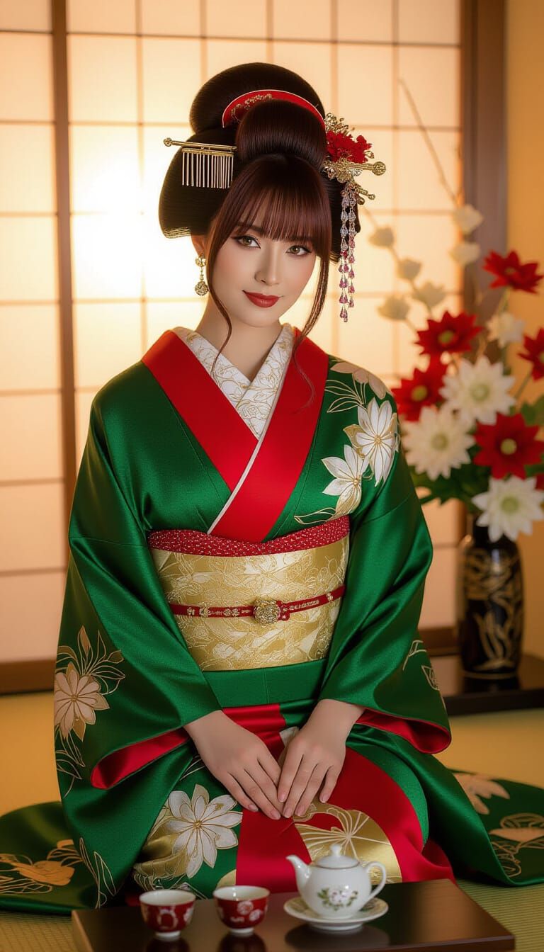 This image shows a Caucasian woman with burgundy hair in a geisha bun, wearing a green and red kimono with gold embroidery. She sits elegantly with a table holding tea and flowers, in a cinematic portrait style.