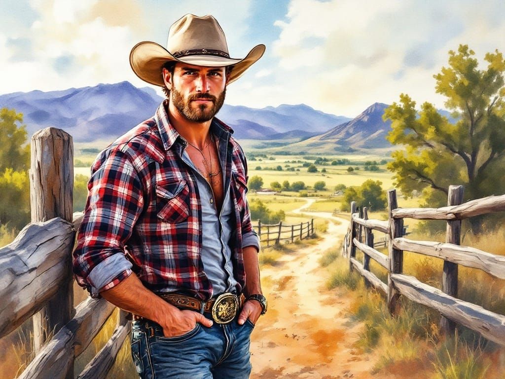 This watercolor painting depicts a handsome cowboy standing confidently against a warm and inviting ranch backdrop, with lush pastures and a majestic mountain range softly fading into the distance.