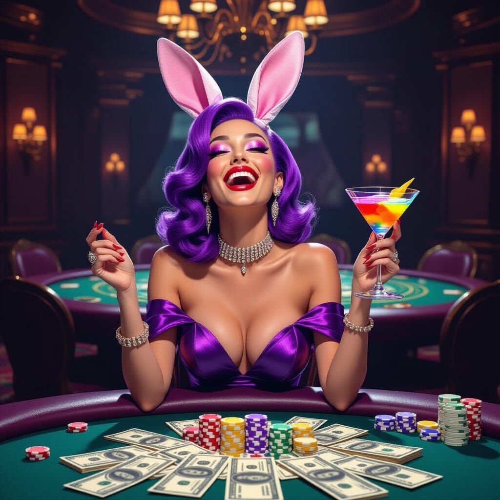 A digital artwork of a Playgirl bunny with purple hair laughing while holding a colorful martini. She is in a luxurious room filled with scattered money, rendered with vibrant colors and sleek lines.
