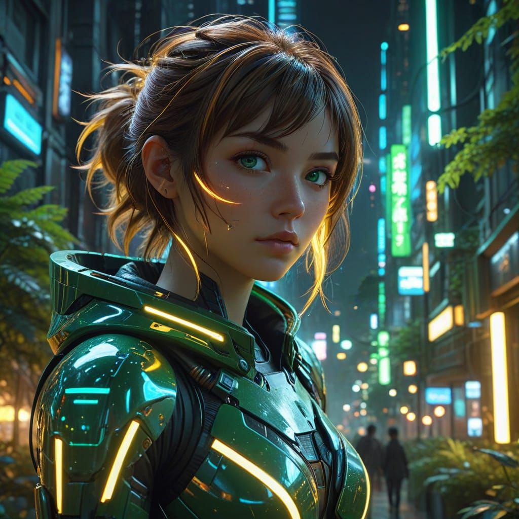 This image shows a girl in a futuristic city with glowing neon lights and lush green forests. The anime art is rendered in 3D with dynamic atmospheric effects and warm golden lighting.
