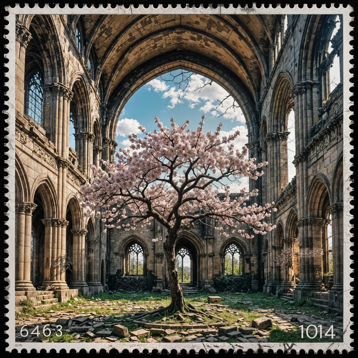 This image shows a postage stamp of a cherry blossom tree inside a ruined cathedral. The picture features intricate details, sharp focus, high contrast, and atmospheric mood in a hyperrealistic style.