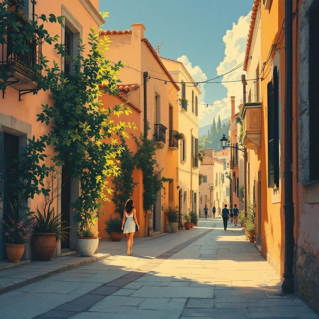 This image shows a figure walking down a sunlit street. The artwork blends neoclassical linework with stylized shapes to create a modern homage to ancient Greek vase painting.