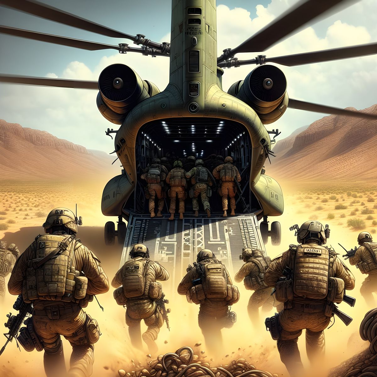 This intense scene depicts a Boeing CH-47 Chinook helicopter in a desert landscape, its engines prominent as soldiers in combat gear sprint away. The vivid, action-packed artwork is reminiscent of a comic book illustration.