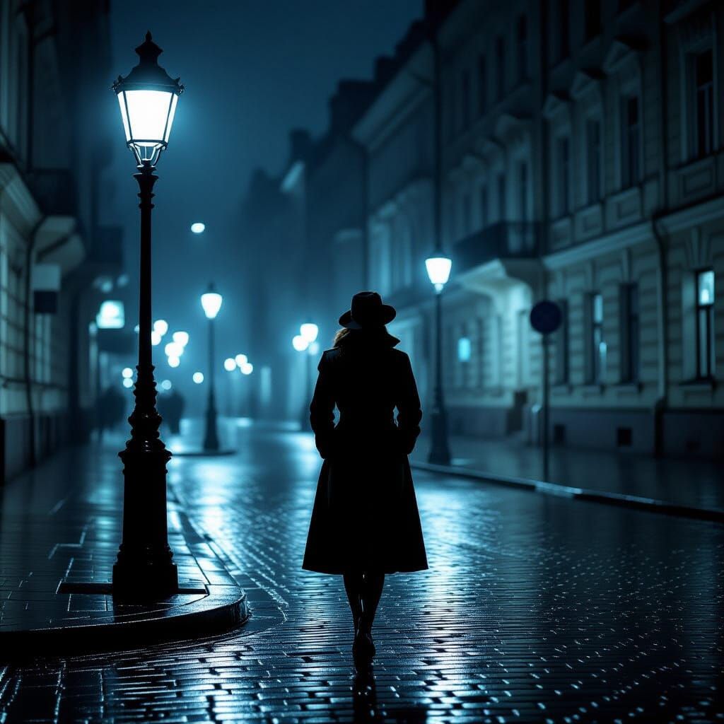 A solitary Russian woman in a trench coat stands on a rain-slicked street at midnight, illuminated by a flickering gas lamp. Captures film noir mood with dramatic shadows and nostalgic melancholy.