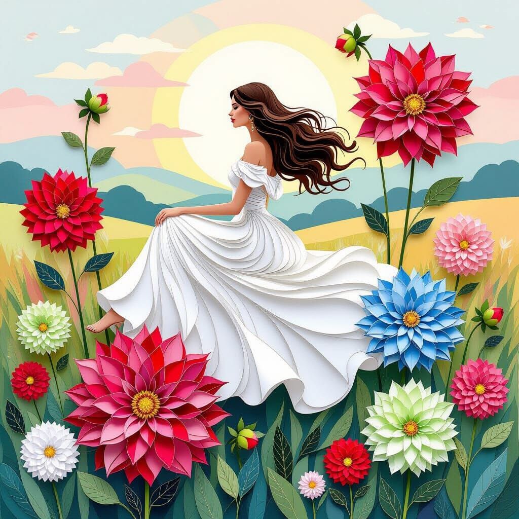 This image shows a beautiful woman with long brown hair in a white dress sitting confidently on a dahlia. The artwork has a paper quilling effect with acrylic and oil painting techniques and white foil details. The style is reminiscent of digital concept art.