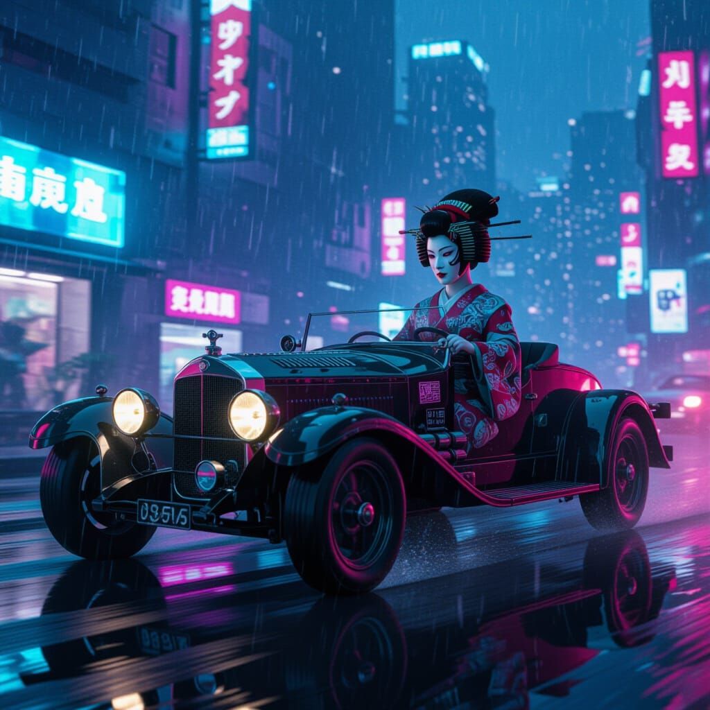 This image shows a vintage car speeding through a futuristic cyberpunk city. The car features neon lights and advanced weaponry. A digital geisha drives, her face hidden. It's rendered in cinematic style with dramatic lighting.