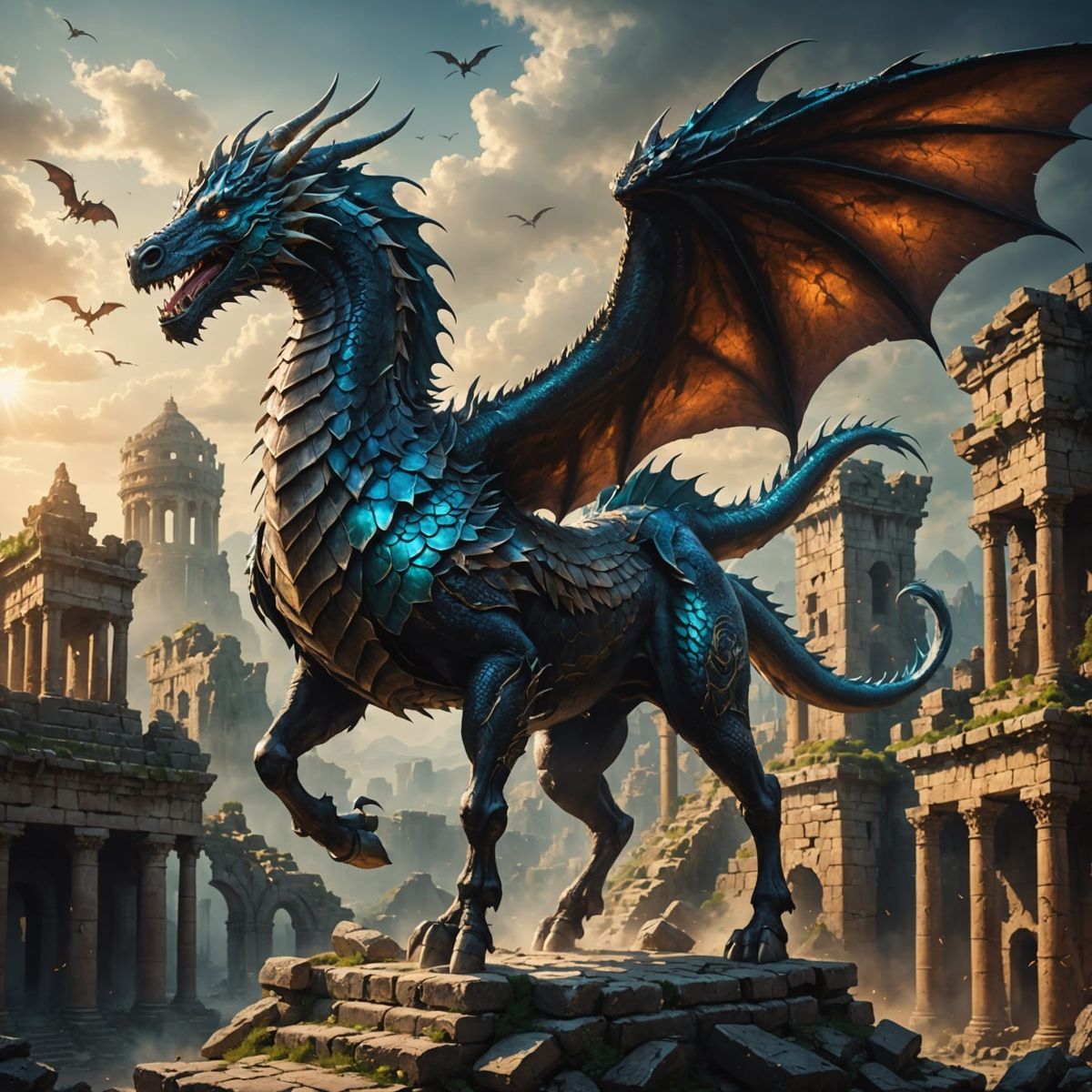 This image depicts a regal dragon-horse hybrid in mid-flight, set against the backdrop of ancient ruins, with striking dramatic lighting and a sense of epic fantasy. Rendered in a style reminiscent of concept art.