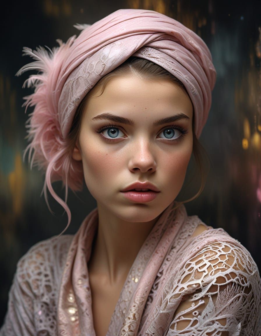 A striking close-up portrait of a model featuring grunge tattoos and a 50s hairstyle. The image showcases soft focus, glittery eyes, and a pink and gold color palette in an ultra-reflective impasto style.