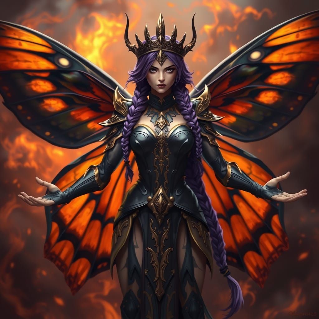 This image shows a powerful female figure with intricate black and gold armor, surrounded by vibrant butterfly wings and a dramatic backdrop of swirling flames, exuding a sense of mystique and strength