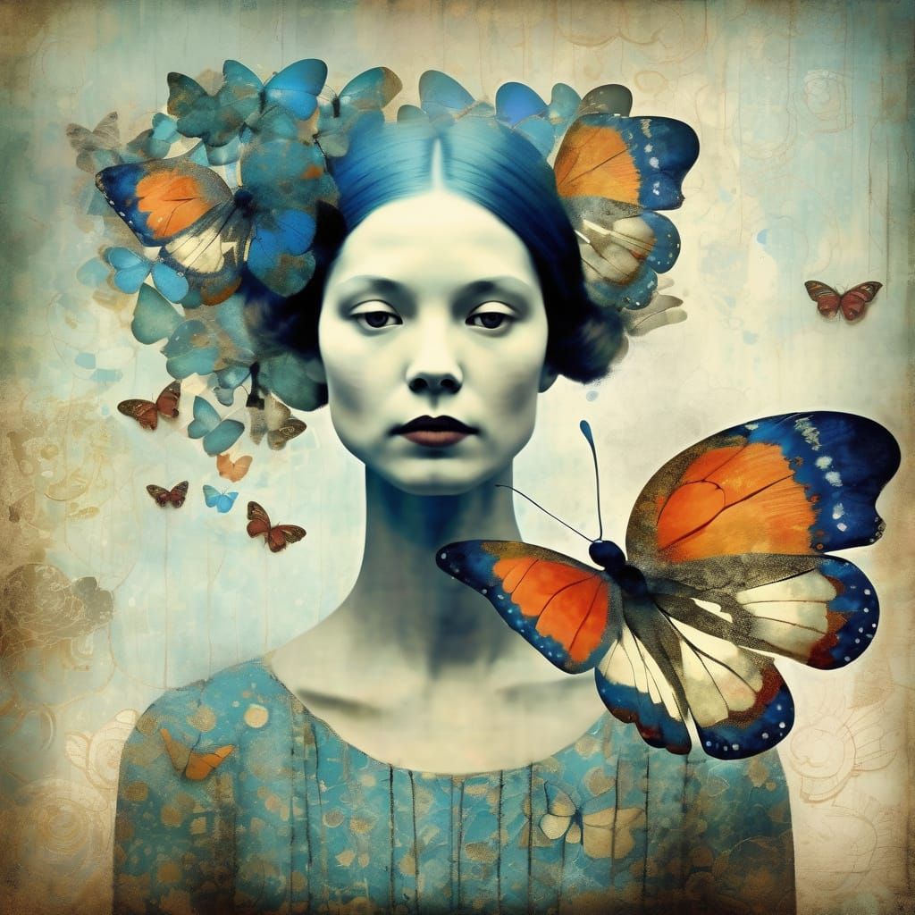 A striking picture of a butterfly woman in a surreal portrait. The image employs impressionistic techniques to highlight light, detail, and sharpness.