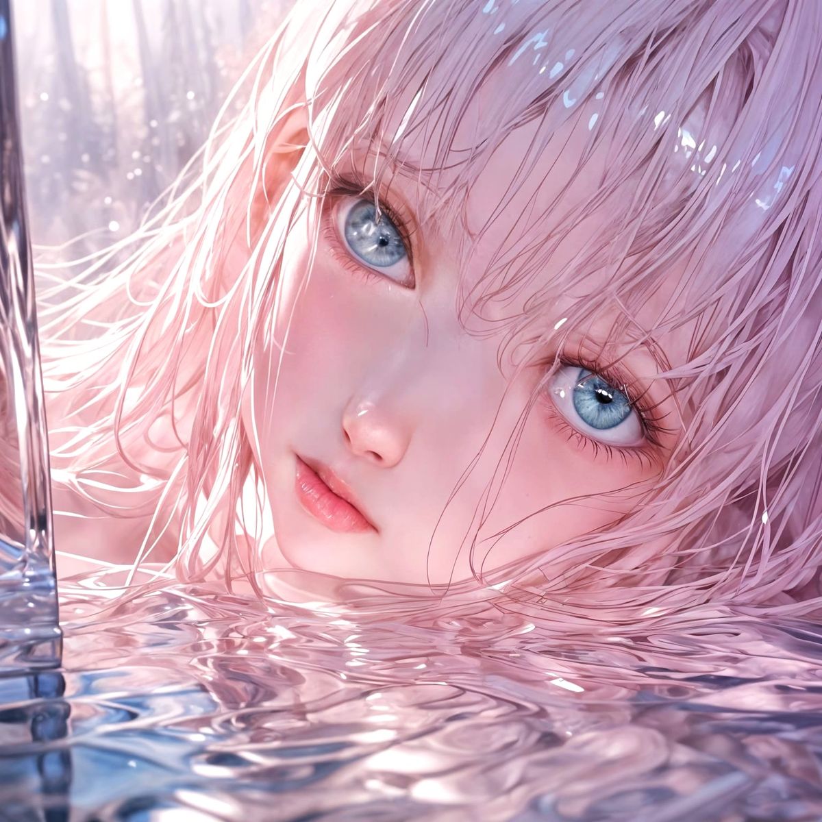 This image shows a close-up of a beautiful woman with long, pale pink hair, rosy lips, and big, reflective blue eyes. The scene is dreamy, aesthetic, and ethereal, with a glassy, reflective quality.